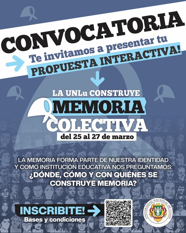 El objetivo de esta convocatoria es la presentación de propuestas de actividades interactivas que se desarrollarán del 25 al 27 de marzo, en todas las Sedes y Centros Regionales de la UNLu, en conmemoración del Día de la Memoria por la Verdad y la Justicia del 24 de marzo.