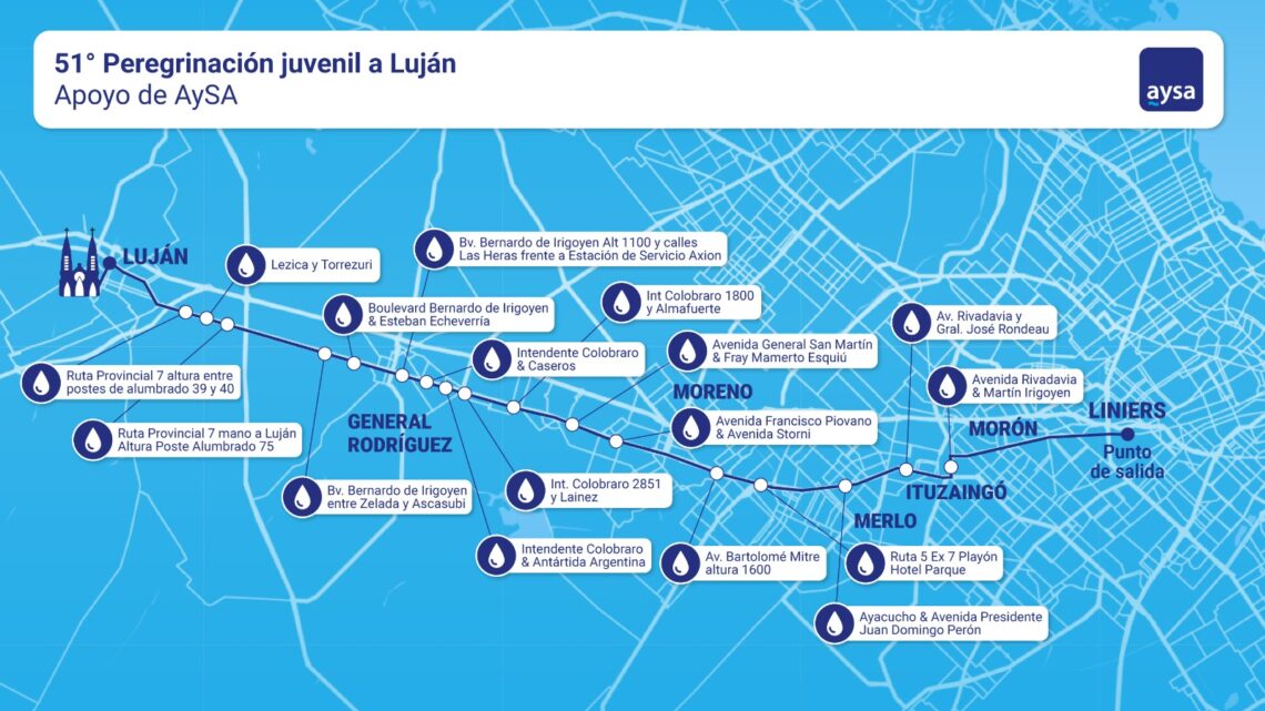 Como todos los años, la empresa de Agua y Saneamientos Argentinos estará presente en la nueva edición de la Peregrinación a Luján con un operativo especial de asistencia de agua potable.