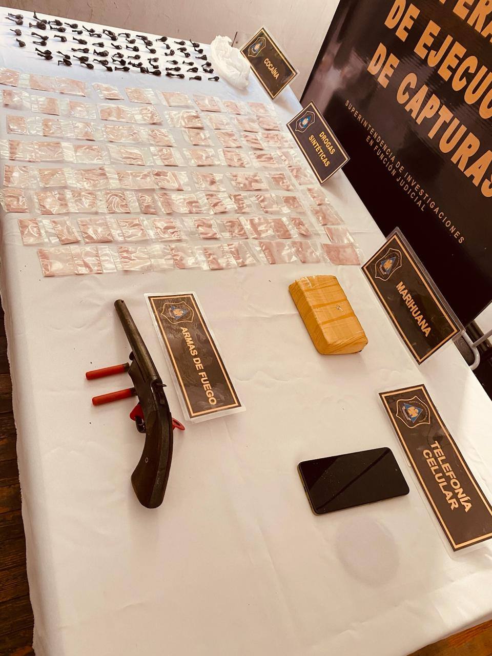 El procedimiento fue solicitado por la UFI Nº 12 especializada en Narcotráfico y ordenado por el Juzgado de Garantías Nº 2. Se realizó en una vivienda ubicada sobre la calle Jujuy, donde se secuestraron envoltorios de cocaína fraccionada, marihuana, drogas sintéticas tipo “Tussi” y un arma de fuego.