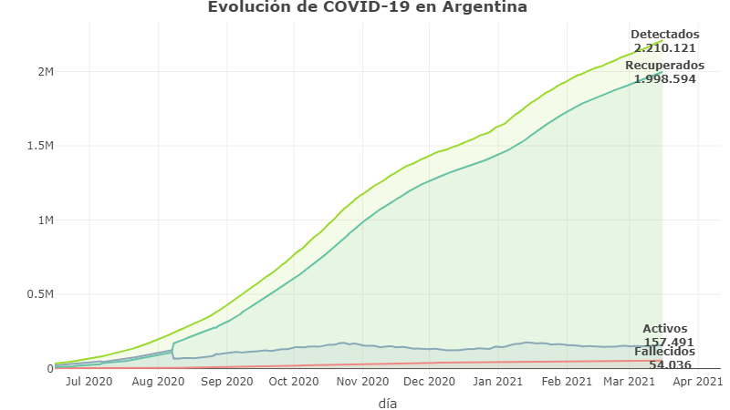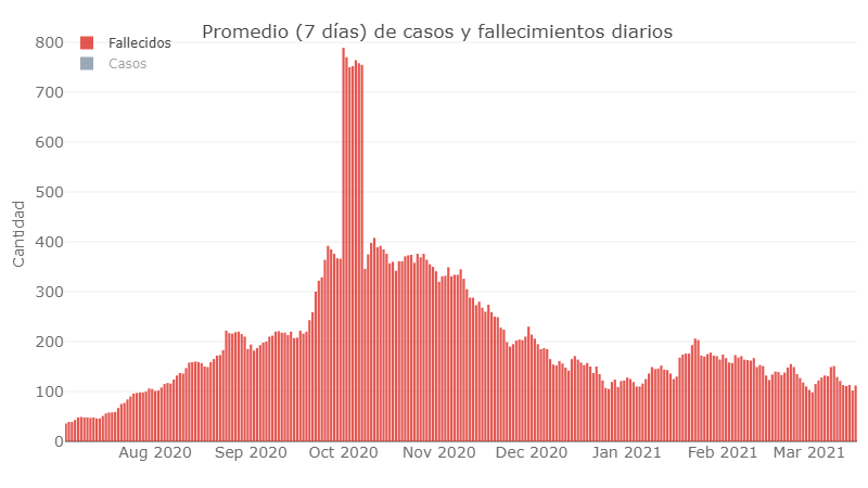 detalló que el 2 de marzo el promedio nacional de casos diarios era de 5.921, mientras que el martes fue de 6.874, es decir que si la información se analiza contemplando 14 días el aumento de casos diarios promedios asciende a un 13%.