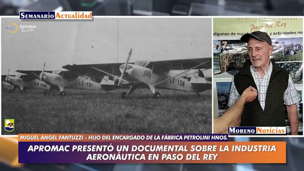 En la sede del Club Social de Paso del Rey, APROMAC (Asociación Protectora del Medio Ambiente y la Cultura) presentó un breve trabajo documental sobre la fabricación del avión “El Boyero” en esa localidad morenense promediando el siglo pasado. Entrevista con Carmelo Ianni (presidente de la ONG), Miguel Ángel Fantuzzi (fabricante de aviones e hijo de Santiago Fantuzzi, uno de los encargados de la fábrica Petrolini Hnos. de Paso del Rey)y Juan Arroyo (miembro de la comisión de APROM