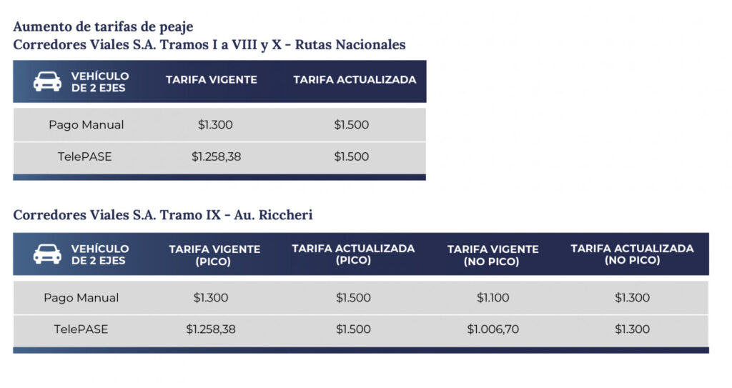 Vialidad Nacional aprobó los nuevos cuadros tarifarios para las estaciones de peaje correspondientes a los tramos I al X operados por la empresa concesionaria Corredores Viales S.A..