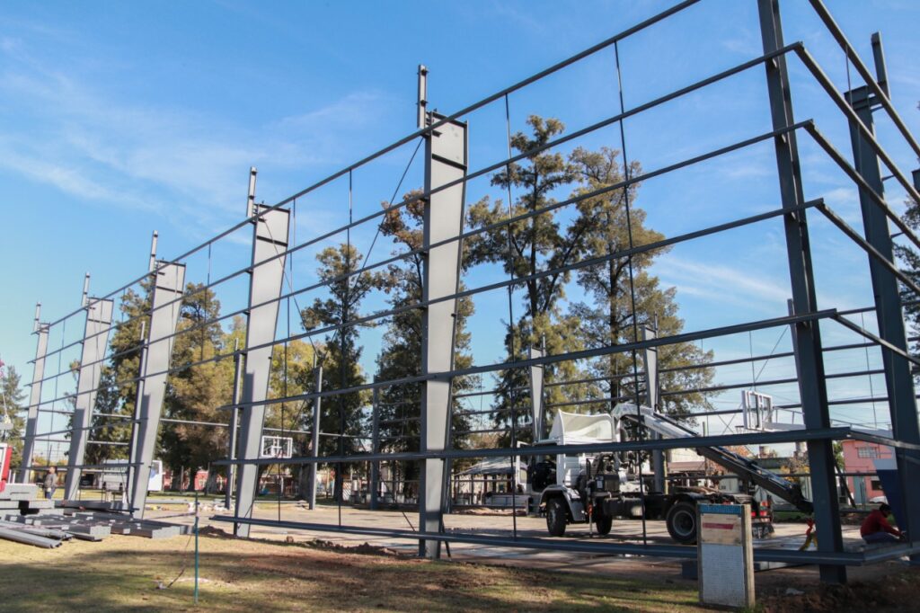 Se trata del techado del playón de la cancha de basquetbol y handball que se realiza con fondos del Ministerio de Turismo y Deporte de la Nación, a partir del acuerdo que firmó la intendenta Mariel Fernández con el ministro Matías Lammens, y con fondos municipales. La obra tiene un plazo estimado de 6 semanas y actualmente se monta la estructura metálica.