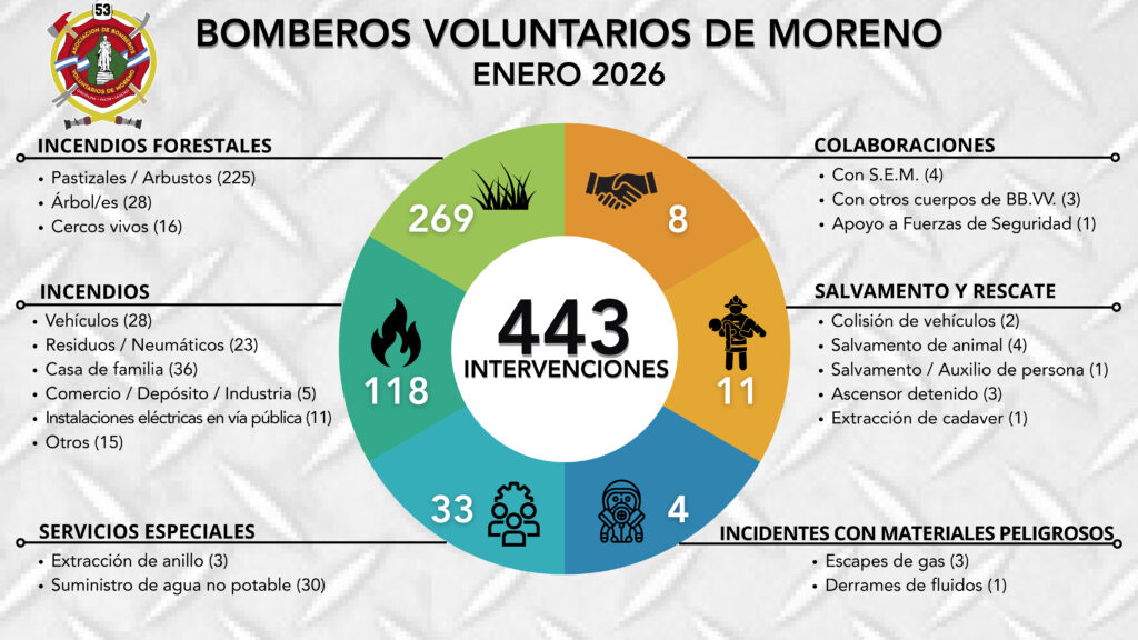 En enero de este año, los Bomberos Voluntarios de Moreno tuvieron 443 intervenciones, sin considerar en esta estadística los llamados falsos. Marca una tendencia creciente en la época estival.