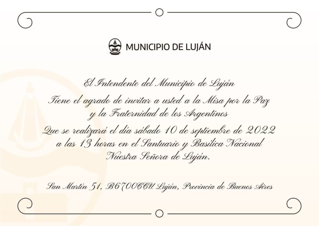 La convocatoria a la denominada «Misa por la Paz y la Fraternidad de los Argentinos» -prevista para este sábado a las 13 en la basílica de Luján- surgió de parte del intendente de ese distrito, Leonardo Boto, quien realizó una invitación a «todas las fuerzas políticas y sus representantes y vecinos y vecinas de otras confesiones cristianas y religiosas».