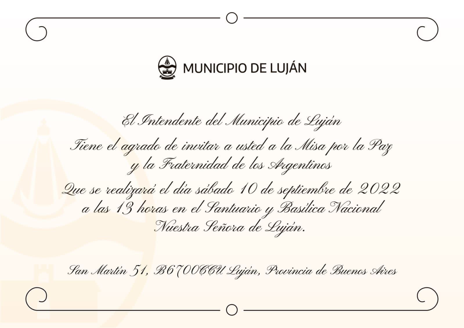 La convocatoria a la denominada «Misa por la Paz y la Fraternidad de los Argentinos» -prevista para este sábado a las 13 en la basílica de Luján- surgió de parte del intendente de ese distrito, Leonardo Boto, quien realizó una invitación a «todas las fuerzas políticas y sus representantes y vecinos y vecinas de otras confesiones cristianas y religiosas».