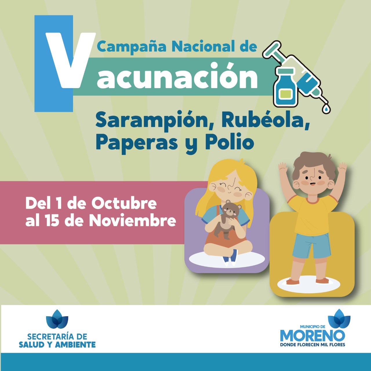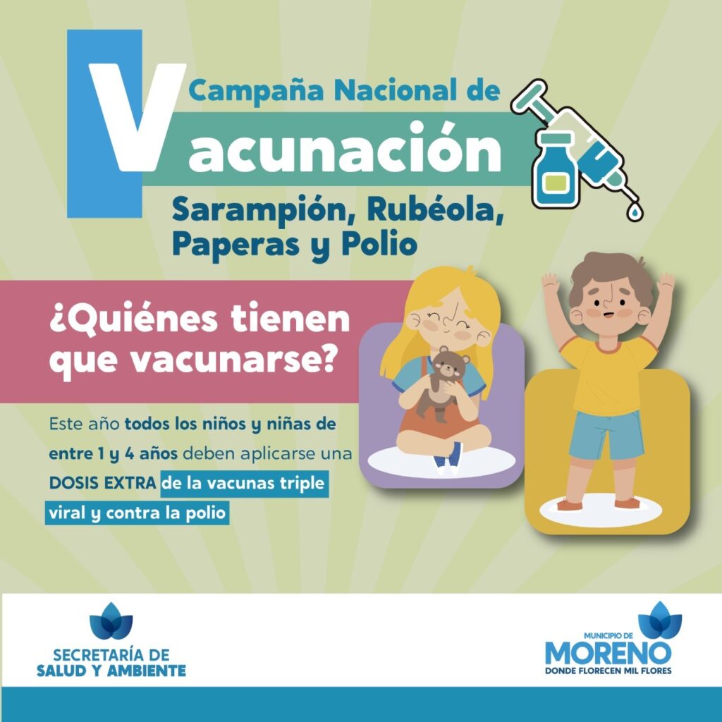 El Municipio de Moreno, a través de la Secretaría de Salud y Ambiente, informa a la comunidad que se desarrollará la Campaña Nacional de Vacunación contra el sarampión, la rubéola, paperas y polio desde el 1° de octubre hasta el 15 de noviembre.