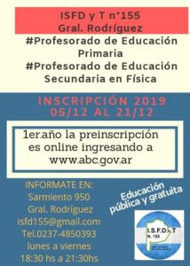 Inscripción 2019 para los profesorados en el Instituto 155 de Formación Docente de General Rodríguez