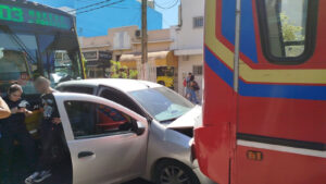 Fuerte choque en el centro de Moreno: Auto quedó atrapado en medio de dos colectivos