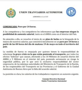 Fue decretado por la Unión Tranviaria Automotor (UTA) para todo el país. Es en reclamo [...]
