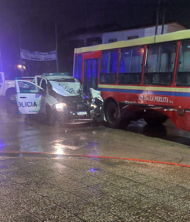 Minutos antes de las 5 de la mañana de este lunes 15 de septiembre, un móvil del Comando de Patrullas chocó de frente contra el lateral derecho de un colectivo de Transportes La Perlita. Los dos oficiales fueron trasladados al hospital de Moreno y están graves. Iban en persecución de una moto en fuga, según revelaron las fuentes consultadas.
