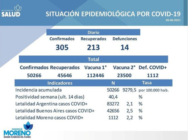 SaludCoronavirus en Moreno: 1.112 fallecidos se registraron y la enfermedad golpea fuerte en el distrito Posted on 9 junio, 202114 junio, 2021 by rodrigos 09 Jun Informe sobre coronavirus en la región: Reporte hasta la mañana del 9 de junio Informe sobre coronavirus en la región: Reporte hasta la mañana del 10 de junio