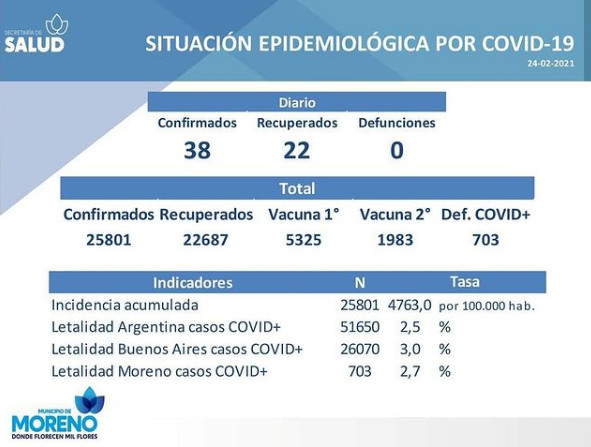 SaludCoronavirus en Moreno: Con 38 nuevos casos confirmados, los contagiados en el distrito son 25801 Posted on 24 febrero, 202125 febrero, 2021 by rodrigos 24 Feb General Rodríguez recibió 21 móviles con destino a la Policía, Tránsito y Defensa Civil La UTA amenaza con un paro general el viernes si no hay acuerdo con los empresarios