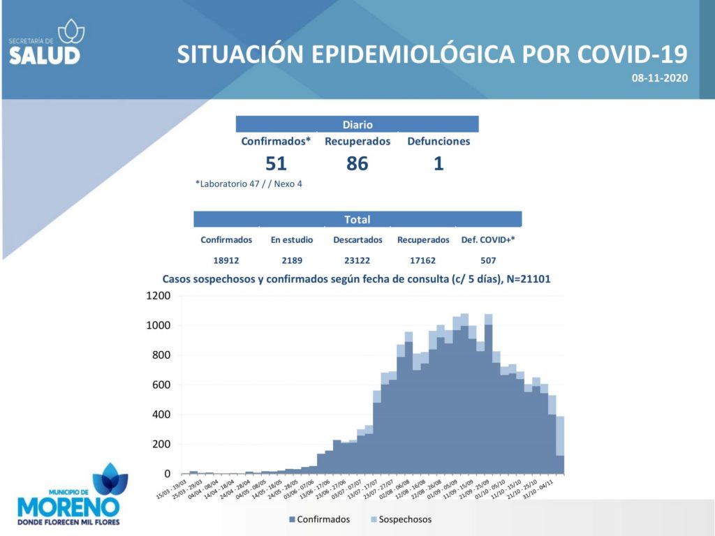 SaludCoronavirus en Moreno: Los fallecidos producto de la pandemia ya son 507 Posted on 8 noviembre, 20208 noviembre, 2020 by rodrigos 08 Nov En el día de la fecha se registraron 51 nuevos casos de coronavirus en el distrito, 86 recuperados y 1 fallecidos Había salido a finales de agosto de la cárcel por un homicidio y ahora lo acusan de asesinar a un vecino en el barrio Santa Paula Informe sobre coronavirus en la región: Reporte hasta la mañana del 8 de noviembre