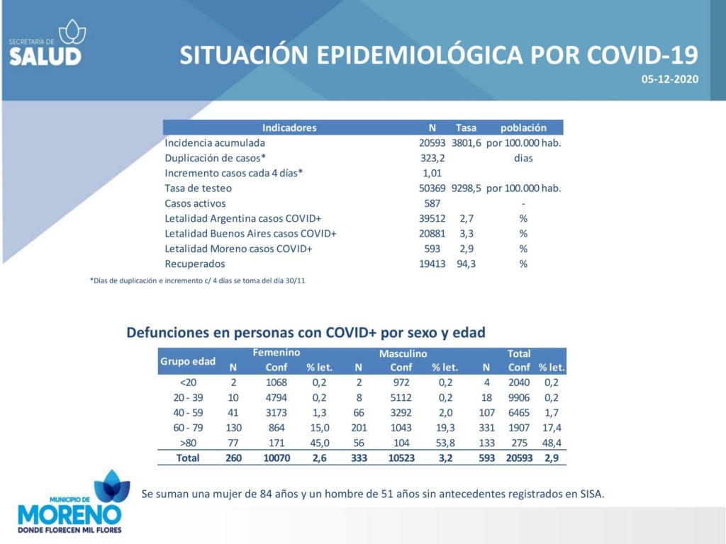 SaludCoronavirus en Moreno: Se registraron 2 fallecidos más y ya son 593 los muertos por la enfermedad en el distrito Posted on 5 diciembre, 20205 diciembre, 2020 by rodrigos 05 Dic Coronavirus en Moreno: Con 23 nuevos casos confirmados, los contagiados en el distrito son 20502 Informe sobre coronavirus en la región: Reporte hasta la mañana del 5 de diciembre