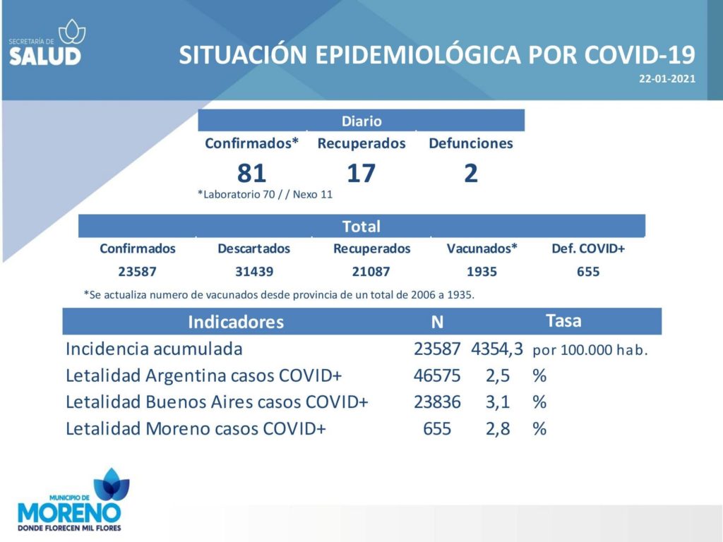 SaludCoronavirus en Moreno: Se registraron 2 fallecidos más y ya son 655 los muertos por la enfermedad en el distrito Posted on 22 enero, 202122 enero, 2021 by rodrigos 22 Ene Le dispararon en el pecho para robarle: Murió horas después en el hospital Informe sobre coronavirus en la región: Reporte hasta la mañana del 22 de enero