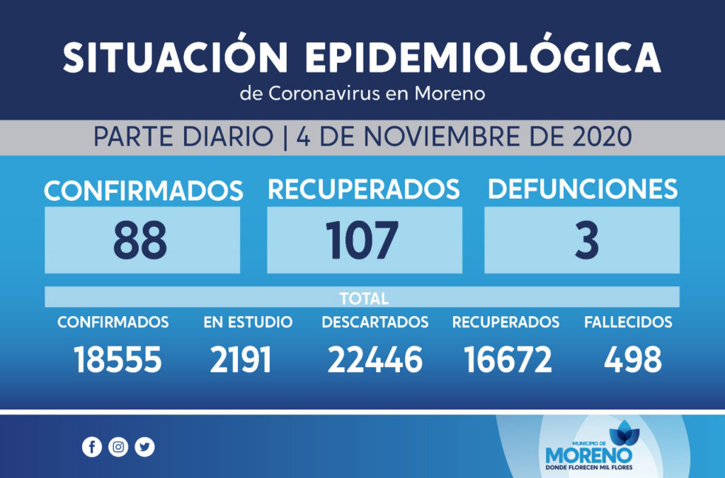 SaludCoronavirus en Moreno: Se registraron 3 fallecidos más y ya son 498 los muertos por la enfermedad en el distrito Posted on 4 noviembre, 20204 noviembre, 2020 by rodrigos 04 Nov En el día de la fecha se registraron 88 nuevos casos de coronavirus en el distrito, 107 recuperados y 3 fallecidos Es no vidente, estudiante universitaria, no tiene trabajo y canta en la línea Sarmiento Informe sobre coronavirus en la región: Reportes hasta la mañana del 4 de noviembre