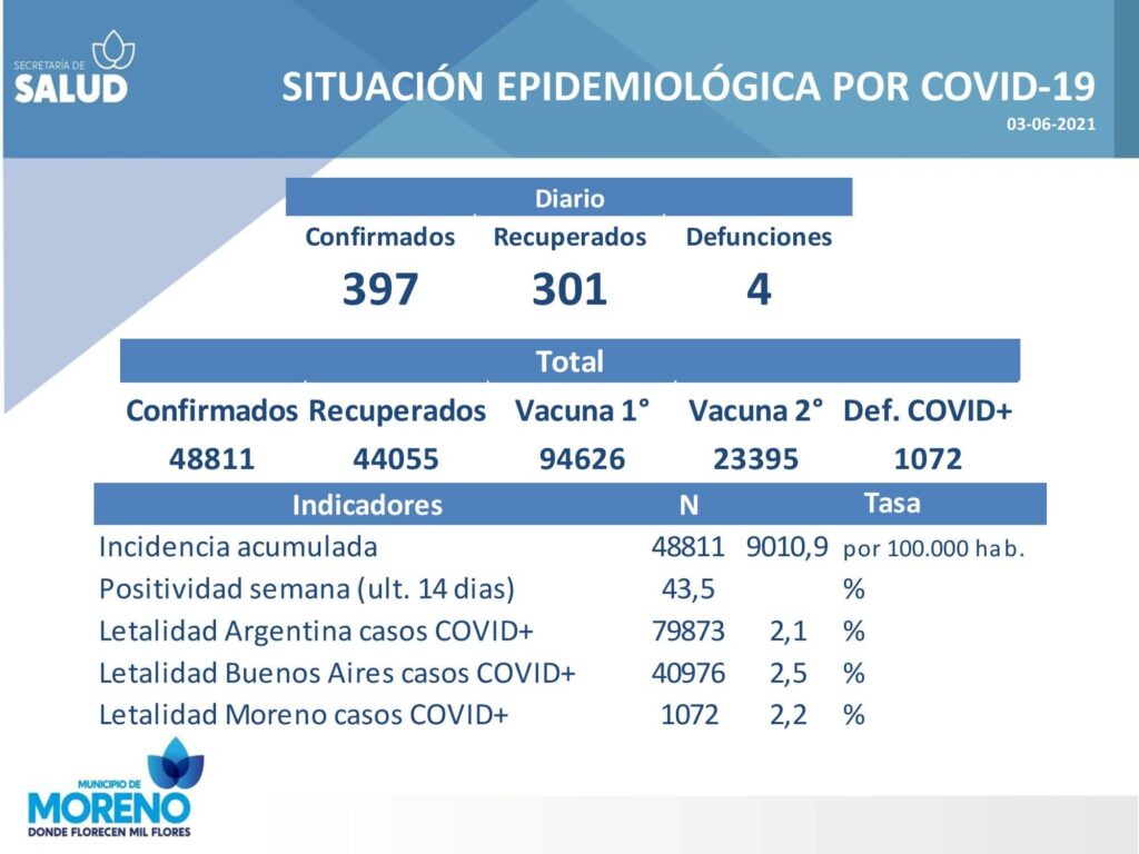 SaludCoronavirus en Moreno: Se registraron 4 fallecidos más y ya son 1072 los muertos por la enfermedad en el distrito Posted on 4 junio, 20214 junio, 2021 by rodrigos 04 Jun Firman convenio de implementación de alerta temprana de desalojos Informe sobre coronavirus en la región: Reporte hasta la mañana del 4 de junio