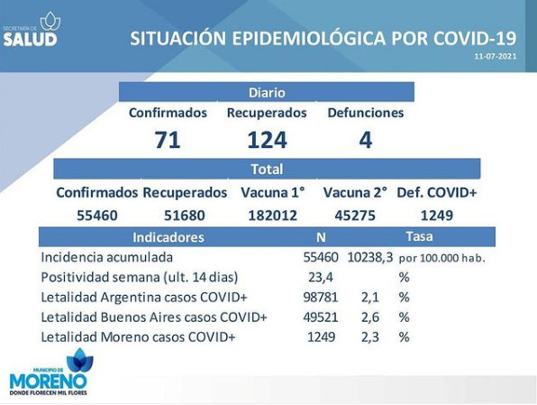 SaludCoronavirus en Moreno: Se registraron 4 fallecidos más y ya son 1249 los muertos por la enfermedad en el distrito Posted on 11 julio, 202112 julio, 2021 by rodrigos 11 Jul En franco deterioro, exigen la finalización de la obra de la Secundaria 32 de Villanueva Mariel Fernández, Trotta y Arroyo inauguraron el primer centro socioeducativo comunitario del país en Cuartel V