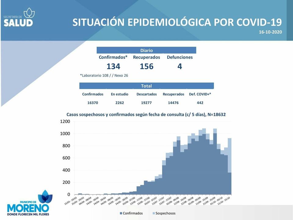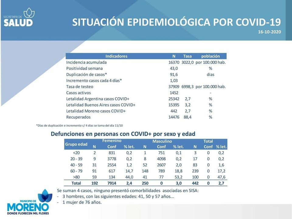 SaludCoronavirus en Moreno: Se registraron 4 fallecidos más y ya son 442 los muertos por la enfermedad en el distrito Posted on 16 octubre, 202018 octubre, 2020 by rodrigos 16 Oct Se registraron 134 nuevos casos de coronavirus, 156 recuperados y 4 fallecidos Un detenido acusado del femicidio de Sandra García en Parque Trujui Presentaron el Plan AccionAR, de abordaje multidisciplinario en municipios