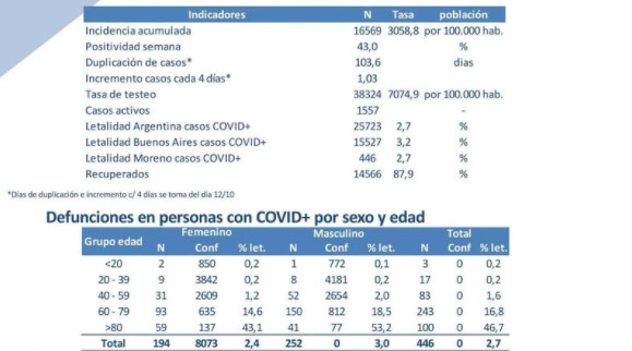 SaludCoronavirus en Moreno: Se registraron 4 fallecidos más y ya son 446 los muertos por la enfermedad en el distrito Posted on 17 octubre, 202018 octubre, 2020 by rodrigos 17 Oct Se registraron en el distrito 199 nuevos casos de coronavirus, 90 recuperados y 4 fallecidos Giro en la investigación por el femicidio de Sandra García: Detuvieron a un sujeto acusado del crimen y liberaron al anterior imputado Informe sobre coronavirus en la región: Reportes hasta la mañana del 17 de octubre