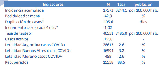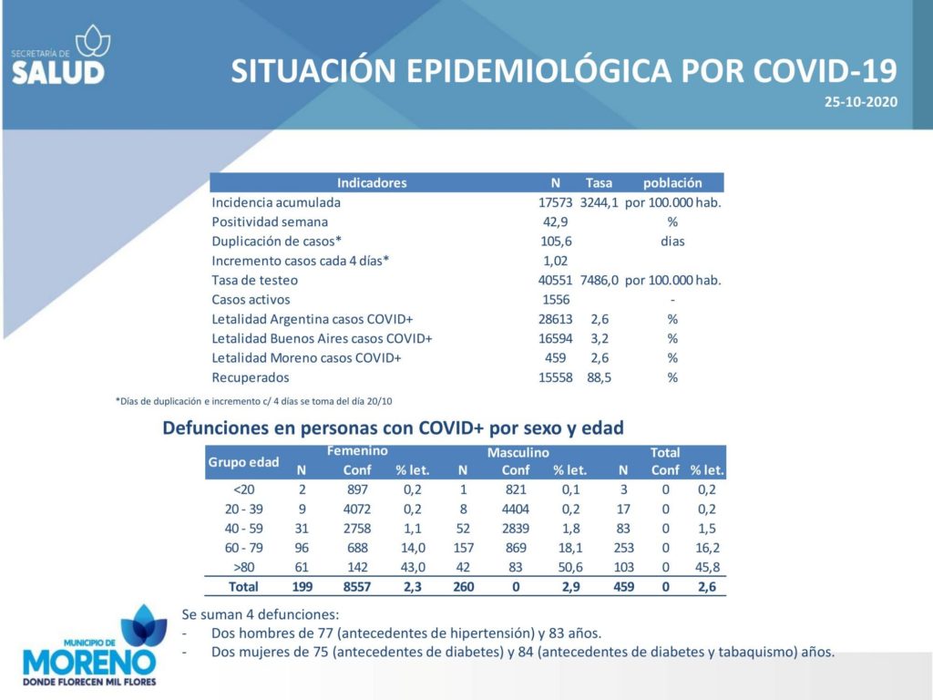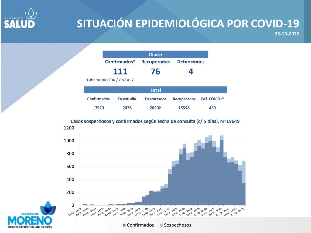 SaludCoronavirus en Moreno: Se registraron 4 fallecidos más y ya son 459 los muertos por la enfermedad en el distrito Posted on 25 octubre, 202025 octubre, 2020 by rodrigos 25 Oct En el día de la fecha se registraron 111 nuevos casos de coronavirus en el distrito, 76 recuperados y 4 fallecidos Brenda evoluciona satisfactoriamente, luego del asalto que casi le cuesta la vida en Villa Salas Informe sobre coronavirus en la región: Reportes hasta la mañana del 25 de octubre