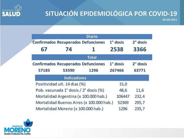 Coronavirus en Moreno: Se registró 1 fallecido más y ya son 1296 los muertos por la enfermedad en el distrito