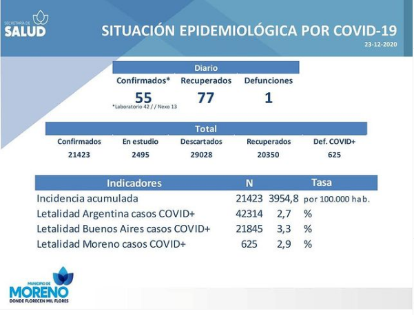 Coronavirus en Moreno: Se registró 1 fallecido más y ya son 625 los muertos por la enfermedad en el distrito