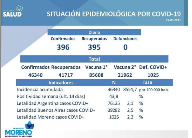 SaludCoronavirus en Moreno: Ya son más de 46 mil los casos positivos de la enfermedad en el distrito Posted on 27 mayo, 20214 junio, 2021 by rodrigos 27 May Hospital de Moreno: «Es una pelea cabeza a cabeza contra el colapso sanitario» Informe sobre coronavirus en la región: Reporte hasta la mañana del 28 de mayo