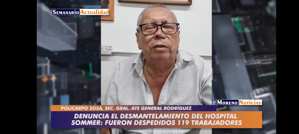 El secretario general de la Asociación de Trabajadores del Estado (ATE) de General Rodríguez Policarpo Sosa denunció el despido de 119 empleados del hospital nacional “Baldomero Sommer”. Consideran que es parte de un programa de desmantelamiento del sistema público de salud. Este jueves por la tarde se reúne la mesa directiva nacional del gremio para evaluar un plan de lucha.