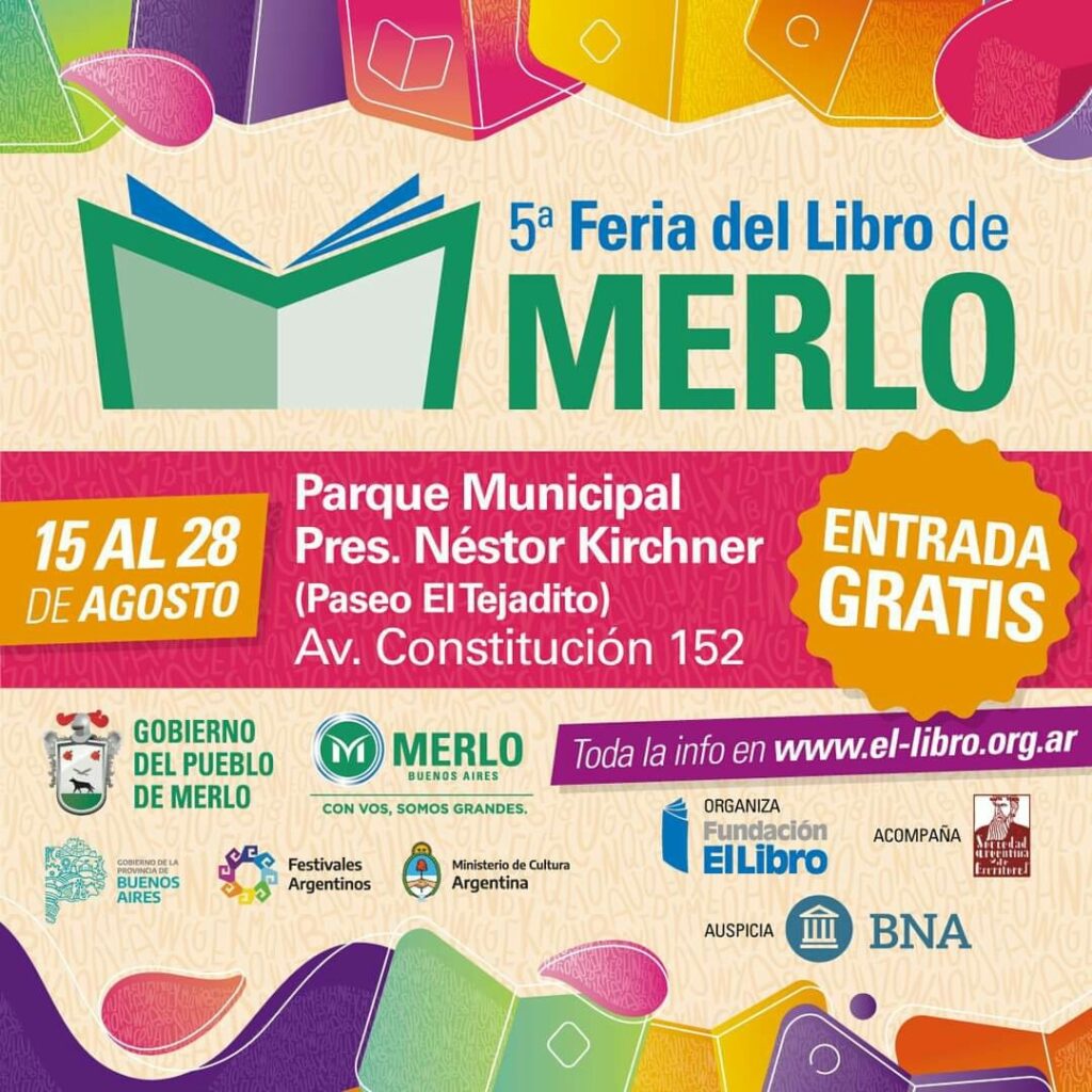 Desde el lunes próximo y hasta el 28 de agosto se realizará la quinta edición de la Feria del Libro de Merlo en el Parque Municipal Presidente Néstor Kirchner (Ex Predio «El Tejadito»), con entrada libre y gratuita, y entre los participantes estarán Luciana Peker, Darío Sztajnszrajber, Claudia Piñeiro, Pedro Saborido, Rep, Alejandro Dolina, Eduardo Sacheri y Felipe Pigna.