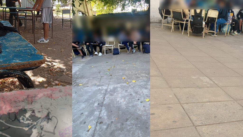 Una situación similar se vive en la secundaria 39, ubicada sobre la calle Uruguay entre avenida Mitre y Alcorta Norte del centro de Moreno. Además de la falta de mobiliario (salvo que el “juego de la silla” haya sido incorporado a la currícula como actividad lúdica) y de salones, se suman problemas de limpieza. Advierten la aparición de una colonia de ratas. También el patio es utilizado como aula.