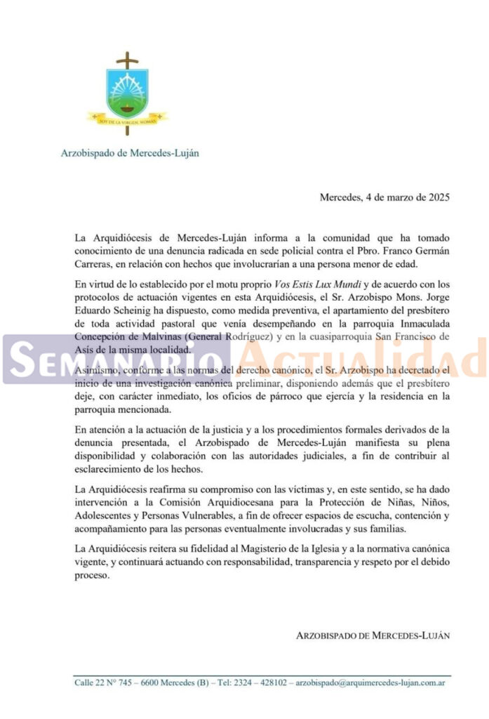 El presbítero Franco Carreras, de 42 años, fue detenido por orden de la Dra. Alejandra Rodríguez, titular de la UFI Nº 9 del Departamento Judicial de Moreno y General Rodríguez. Esta medida fue autorizada por el Juzgado de Garantías Nº 1 de la Dra. Adriana Julián y ejecutada por la DDI (Dirección Departamental de Investigaciones) durante la tarde de este martes 3 de marzo.