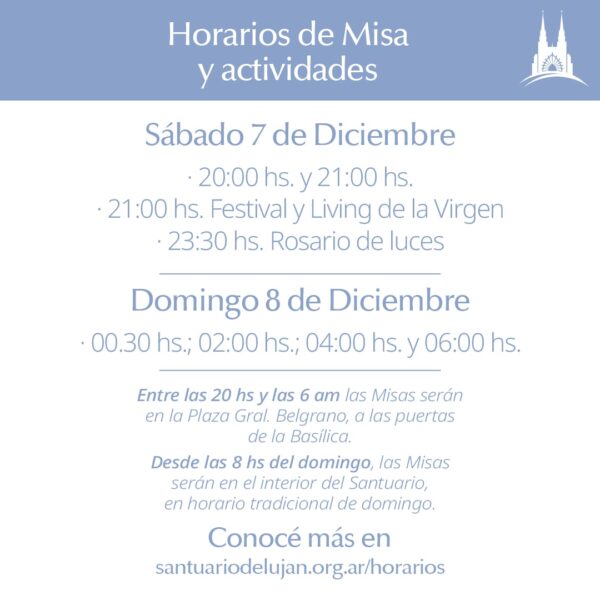 Del mismo, durante el mismo domingo 8 de diciembre, solemnidad de la Inmaculada Concepción, Día de la Virgen, se celebrarán las Misas en los horarios tradicionales de domingo. A continuación, compartimos el flyer que ilustra el cronograma para esta fiesta de la Virgen. (Ver horarios – https://santuariodelujan.org.ar/horarios/)
