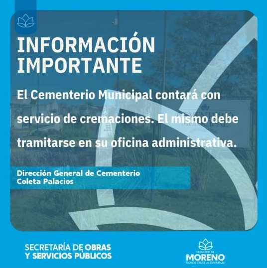 El municipio de Moreno comunicó, a través de Instagram, que contará con un servicio de cremación. En el distrito no hay empresa que brinde esa prestación. Se realizaría en otro partido. Se desconocen detalles. El cementerio sería el nexo con una empresa privada.