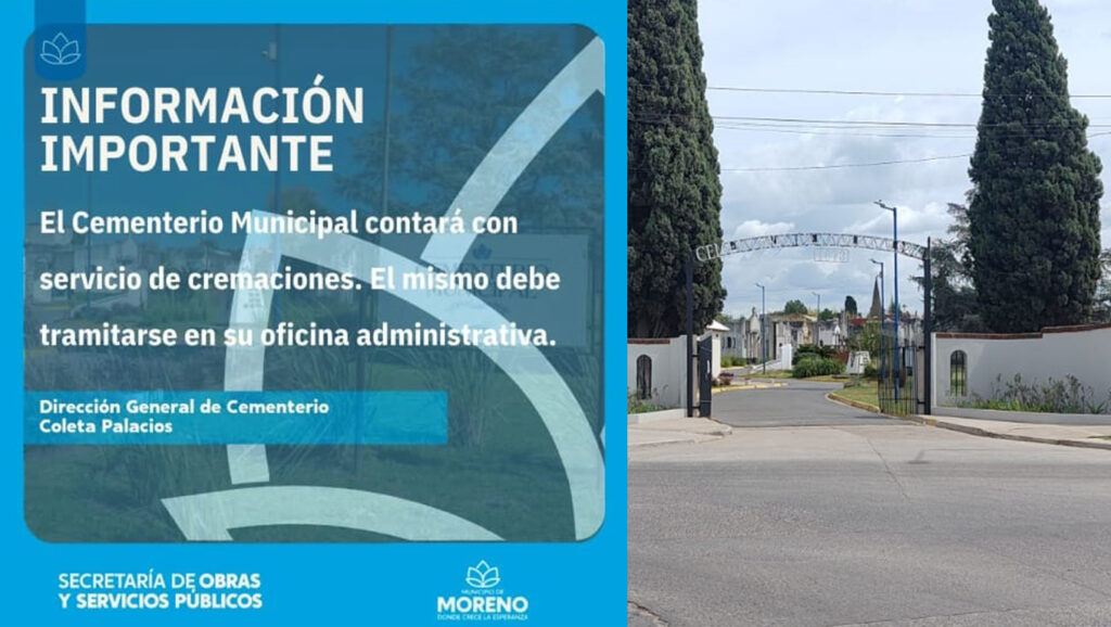 La municipalidad de Moreno, a través de la página de Instagram de la secretaría de Obras y Servicios Públicos (área que conduce la ingeniera agrónoma María Giménez, en plena campaña para llegar a la intendencia de General Rodríguez), publicó el pasado viernes 6 de marzo que el cementerio comunal “Coleta Palacios” comenzaría a prestar el servicio de cremaciones. En el flyer promocional indicaba que el trámite debía realizarse en el área administrativa del camposanto local. No hubo más detalles.