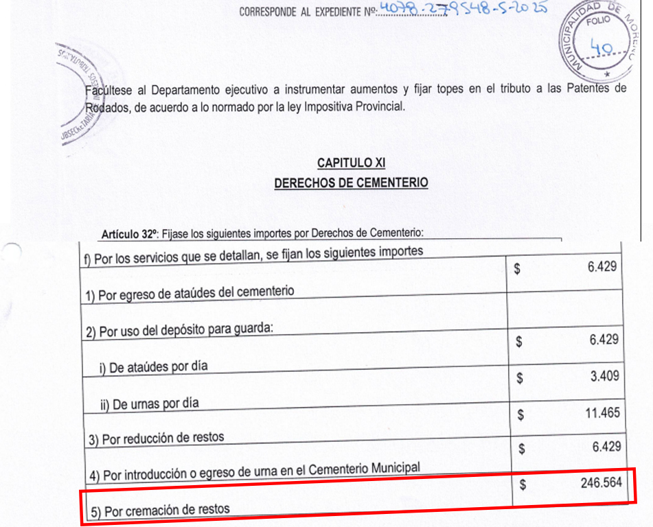 Luego de nuestra infructuosa visita, finalmente desde prensa oficial nos mandaron el siguiente mensaje: “el servicio es contratado por el municipio, se terceriza. Y el servicio no es para cremar un cuerpo recién fallecido, eso lo hacen las cocherías. Es para los que ya están o cuando haya pasado tiempo. Se cobra una tasa como todos los servicios que se prestan en el cementerio”. La tasa sería de 246.564 pesos. Está especificada en el artículo 32 de Derechos de Cementerio inciso f punto 5 de la ordenanza tributaria 2026, votada en el Concejo Deliberante en diciembre pasado.