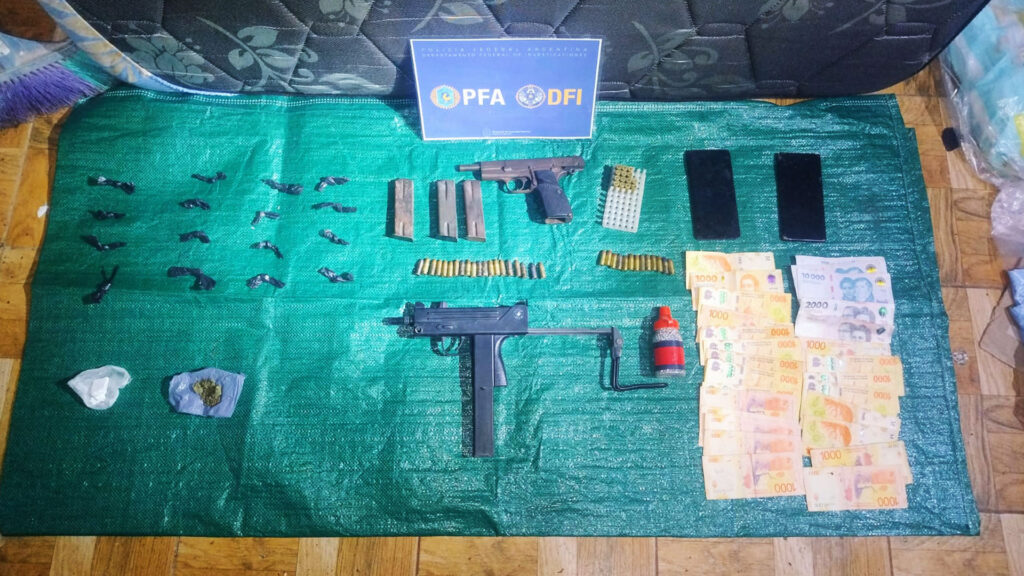 En el lugar se secuestraron varias dosis de cocaína y marihuana, una pistola 9 mm, municiones, una réplica de ametralladora, dos teléfonos celulares, dinero en billetes de baja denominación y otros elementos de interés para la causa.