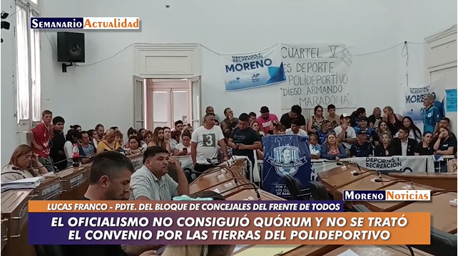 El Frente de Todos, que tiene quórum propio, no logró alcanzar el mínimo de concejales para poder sesionar (falto Andrés D´estefano) y la oposición no ingresó al recinto. Se iba a tratar el polémico convenio por las tierras del polideportivo de Cuartel V. Cabe recordar que ese expediente presentaba una irregularidad en un artículo y no habría sido subsanado.