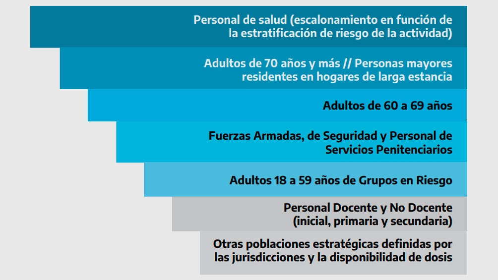 En el tope del riesgo por exposición y funciones se encuentra el personal de salud(escalonado en función de la Fuerzas armadas, de seguridad y personal de servicios penitenciarios). Le sigue el personal docente y no docente (inicial, primaria y secundaria) y otras poblaciones estratégicas definidas por las jurisdicciones y la disponibilidad de dosis.