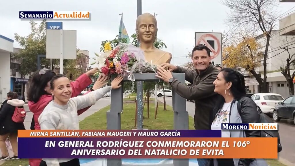 La actividad estuvo organizada por el Consejo de Partido Justicialista de General Rodríguez. Colocaron una ofrenda floral en el busto que recuerda a la “Abanderada de los Humildes”, emplazada en el centro de la ciudad. Este miércoles se cumplieron 106 años del nacimiento de Eva Duarte de Perón. Discursos de la histórica militante Mirna Santillán, de la representante del Movimiento Evita Fabiana Maugeri y del presidente del peronismo local Mauro García.