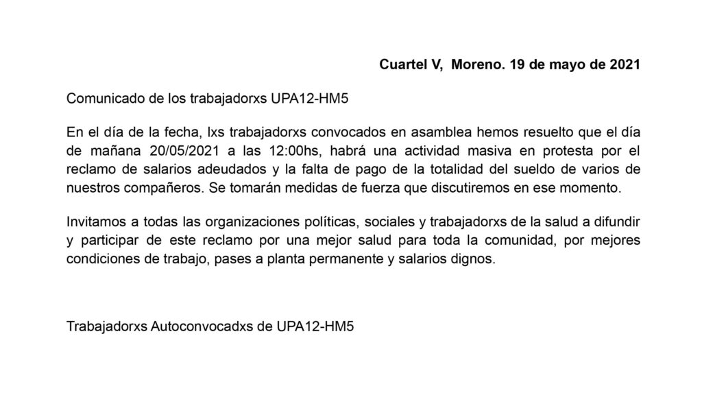 «Comunicado de los trabajadorxs UPA12-HM5