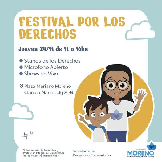 El Municipio de Moreno, a través de la Secretaría de Desarrollo Comunitario, invita a la toda la comunidad a participar del “Festival por los derechos”, en el marco del mes de las Niñeces y Adolescencias, que se desarrollará este jueves 24 de noviembre, de 11 a 16 horas, en la plaza Mariano Moreno, ubicada en Joly y Asconape.