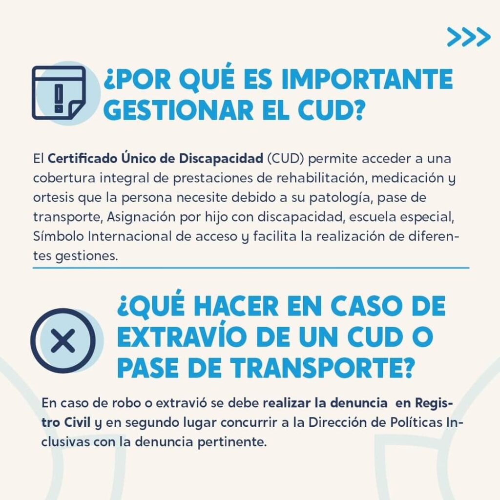 Por otra parte, en caso de robo o extravío del CUD, se deberá realizar la denuncia en el Registro Civil y en segundo lugar concurrir a la Dirección de Políticas Inclusivas con la denuncia pertinente.
