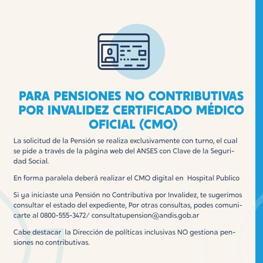 Para Pensiones No Contributivas por invalidez se tramita el Certificado Médico Oficial (CMO). La solicitud de la pensión se realiza exclusivamente con turno el cual se pide a través de la página web de la ANSES con clave de Seguridad Social. Además, en forma paralela deberá realizar el CMO digital en un hospital público. La Dirección de Políticas Inclusivas NO gestiona Pensiones No contributivas.