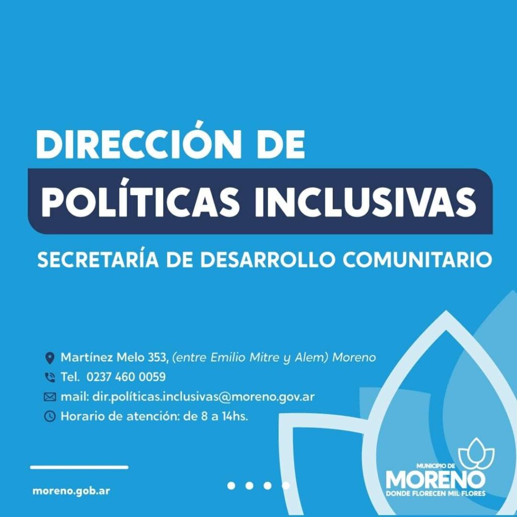 Para más información comunicarse con la Dirección de Políticas Inclusivas de la Secretaría de Desarrollo Comunitario ubicada en Martínez Melo 353, entre Emilio Mitre y Alem; Teléfono: 0237-4600059 o vía e-mail a: dir.politicas.inclusivas@moreno.gov.ar»