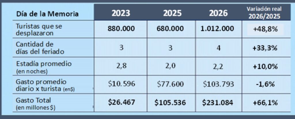 El gasto promedio diario fue de $ 103.793, un 7% menor al gasto del feriado de Carnaval de febrero último. Esto se explica a partir de que los turistas eligieron destinos más cercanos y también porque entre los gastos recreativos no existió la oferta del Carnaval. En cambio, prevalecieron actividades culturales y conmemorativas por el 24 de marzo, casi todas de acceso gratuito. También fue un 1,6% menor al feriado de la Memoria del año pasado, comparado a precios reales.