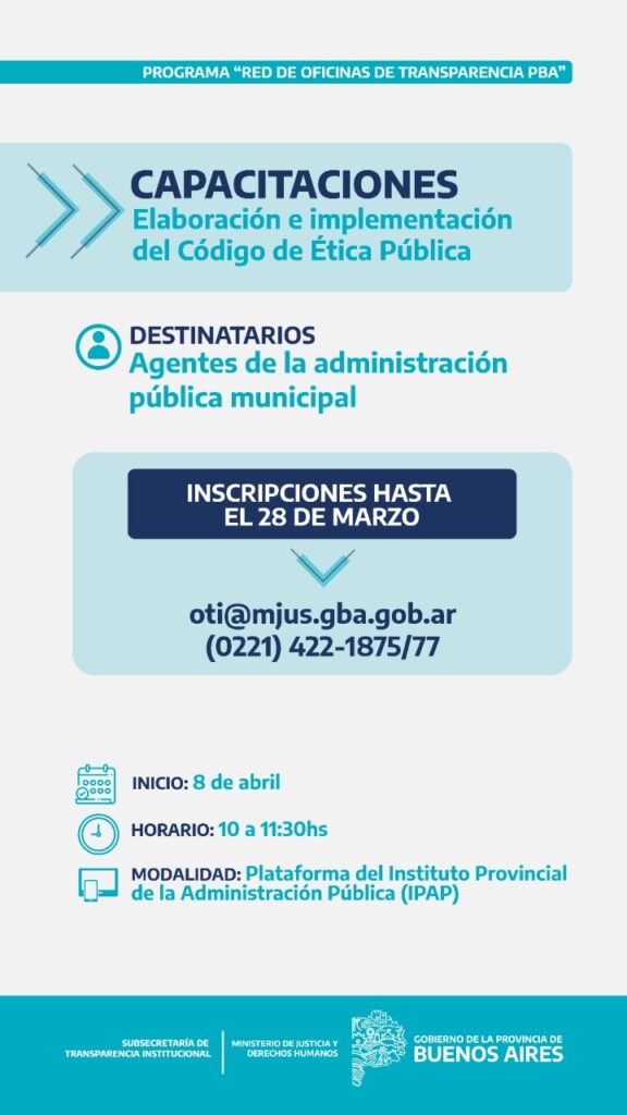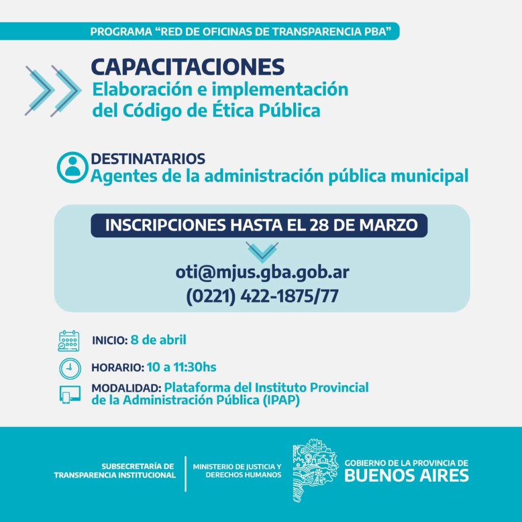 El Ministerio de Justicia y Derechos Humanos de la Provincia a través de la Subsecretaría de Transparencia Institucional, invita a los y las agentes de la administración pública municipal a inscribirse en la capacitación “Elaboración e implementación del Código de Ética Pública”, destinada al personal de los 135 municipios bonaerenses.