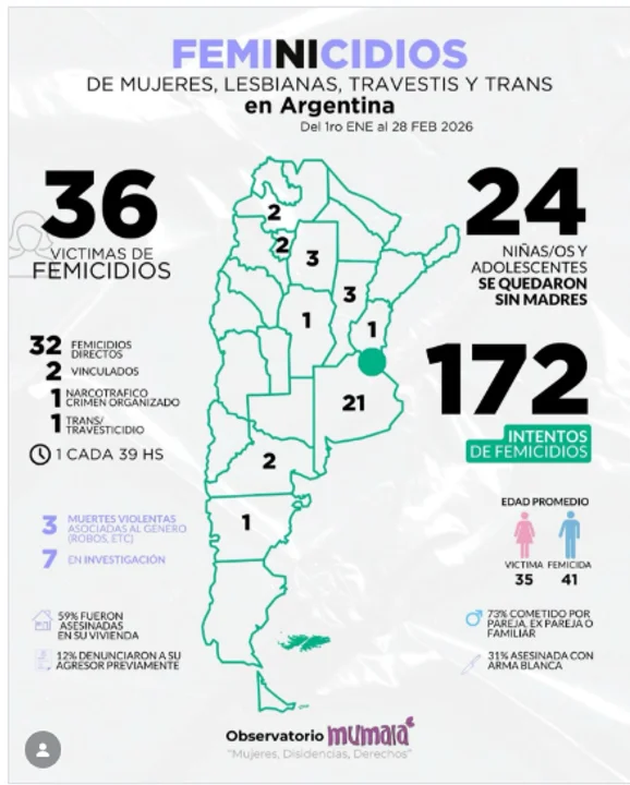 El reporte destaca que la violencia extrema no se limita a los casos consumados. En este breve período de 2026, se contabilizaron 172 intentos de femicidio, evidenciando una situación crítica en materia de seguridad para las mujeres.