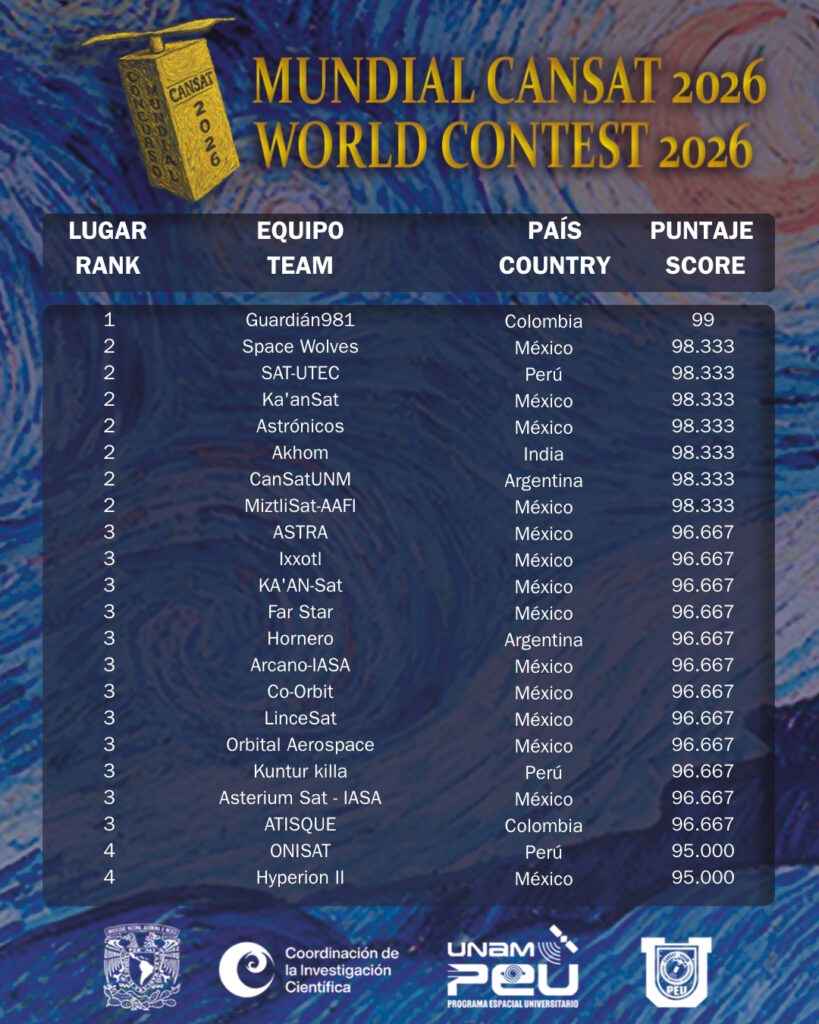 La Universidad Nacional de Moreno (UNM) clasificó a la segunda etapa del Mundial CanSat 2026 (CanSat World Contest) alcanzando el 2º puesto del ranking internacional con un destacado puntaje de 98,333, de acuerdo con el ranking oficial difundido por el Programa Espacial Universitario de la Universidad Nacional Autónoma de México (PEU–UNAM), entidad organizadora del concurso.